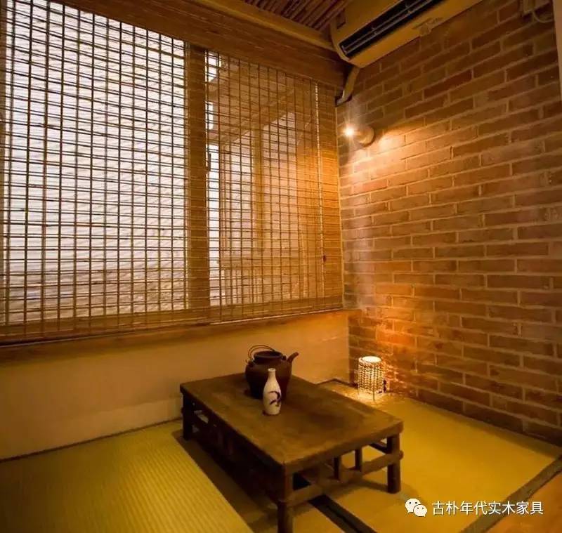 阳台的吊顶也选用了竹子,窗帘为芦苇窗,老炕桌是清末的淘品,榻榻米的垫子为兰草编织,和泛红的青砖可以吸收窗外的潮气,中和室内温度。